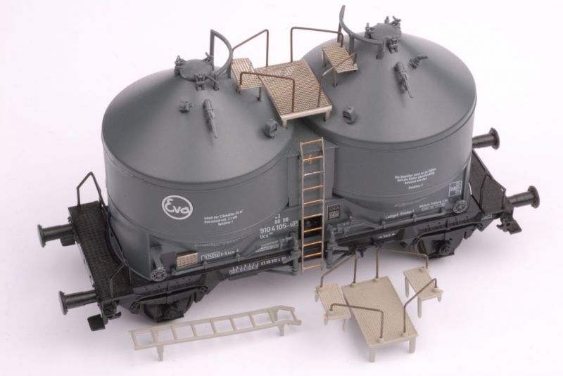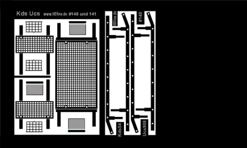 Zurüstsatz für das Roco-Modell Kds 54 - Ucs 908. Das Ätzblech beinhaltet geätzte Leiter-Wangen und 0,3er-Draht für die Tritte sowie durchbrochen geätze Gitterrostbühnen. Gelötete Leitern sind trotz der Filigranität Messingfeingußteilen bezüglich Stabilität überlegen. Weiterhin gehören zum Zurüststatz feine Zettelkästen mit separaten Abdeckgitter in der spezielle flachen Ausführungen für Staubgutwagen. Beim H0fine-Ansatz für Zettelkästen wird nur das obere Deckblech umgekantet und die seitliche Kanten alleine durch die vertiefte Ätzung nachgebildet. Der Zettelhalterkasten kann brüniert und auf den Wagen geklebt werden. Das unbehandelte Abdeckgitter (im Vorbild verzinkt) kann dann mit einen winzigen Laufzettel, der mit etwas Klebstoff getränkt wurde, aufgeklebt werden.