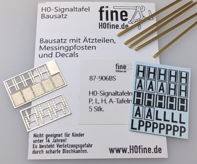 Ätzbausatz für H0-Signaltafeln. 4 Stk. mit Decals (mit Reserve), Masten und Bauanleitung.